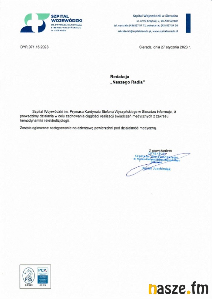 Drogą mejlową dostaliśmy pismo od dyrekcji Szpitala Wojewódzkiego w Sieradzu, w którym czytamy, że prowadzone są działania w celu zachowania ciągłości realizacji świadczeń medycznych z zakresu hemodynamiki i elektrofizjologii. Zostało ogłoszone postępowanie na dzierżawę powierzchni pod działalność medyczną.