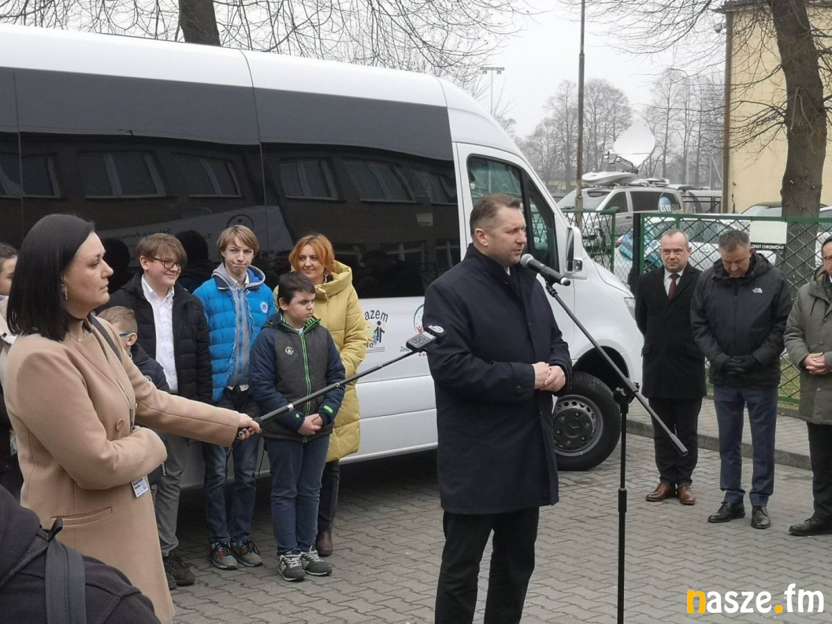 Minister Przemysław Czarnek oraz Edyta Balińska - Zwolińska, prezes Stowarzyszenia na Rzecz Osób Niepełnosprawnych i Poszkodowanych w Wypadkach "Razem możemy wiele" oficjalnie przekazali na ręce dyrektor szkoły Elżbiety Słowińskiej klucze oraz dokumenty do nowego samochodu.