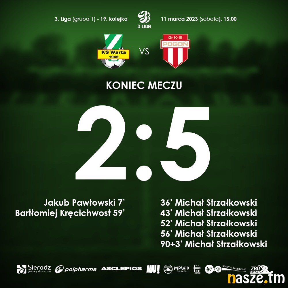 W meczu 19. kolejki III ligi Warta Sieradz przegrała na swoim stadionie z liderem Pogonią Grodzisk Mazowiecki 2:5. Wszystkie gole dla drużyny gości zdobył Michał Strzałkowski.