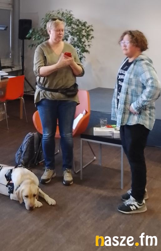 z różnych urządzeń np. telefonu, jak osoby niewidome korzystają z komunikacji miejskiej i na temat pracy psa przewodnika oraz współpracy z osobą niewidomą.