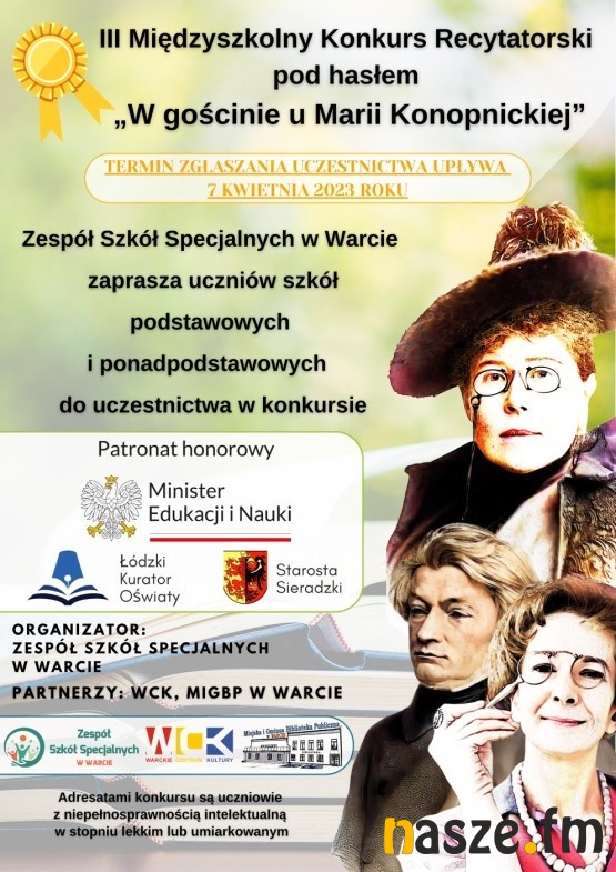 Zespół Szkół Specjalnych w Warcie zaprasza uczniów z niepełnosprawnością intelektualną w stopniu lekkim lub umiarkowanym do udziału w konkursie "W gościnie u Marii Konopnickiej". Konkurs odbędzie się 19 kwietnia w Sali widowiskowej Warckiego Centrum Kultury w Warcie, przy ul. Tadeusza Kościuszki 9/11. Rozpoczęcie planowane jest na godzinę 10.00.