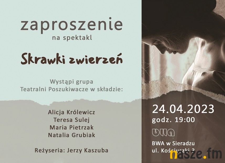 Spektakl jest oparty na tekstach Małgorzaty Halber, Tadeusza Różewicza, Olgi Tokarczuk i Klementyny Hoffmanowej. Rozpocznie się o godz. 19:00 w Galerii A Biura Wystaw Artystycznych w Sieradzu. Scenografią będą obrazy Ewy Golińskiej-Pisarkiewicz, stanowiące część wystawy otwartej 5 kwietnia br. Wystąpi grupa Teatralni Poszukiwacze w składzie: Alicja Królewicz, Teresa Sulej, Maria Pietrzak i Natalia Grubiak. Reżyseria: Jerzy Kaszuba. Wstęp wolny.
