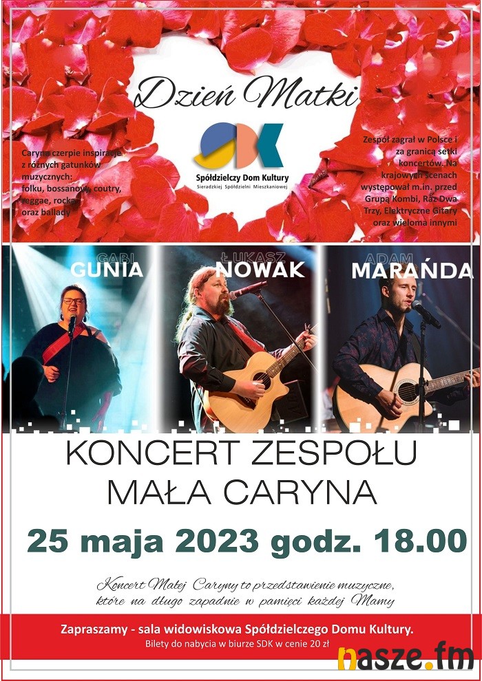 Spółdzielczy Dom Kultury w Sieradzu zaprasza 25 maja wszystkie mamy i nie tylko na koncert z okazji Dnia Matki. Wystąpi zespół Mała Caryna.