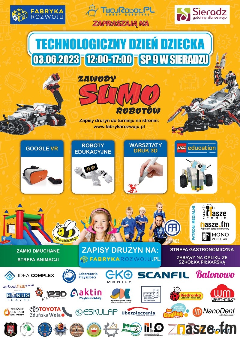 Fabryka Rozwoju wraz z Urzędem Miasta Sieradza zaprasza już jutro na Technologiczny Dzień Dziecka. Główną atrakcją będą zawody Sumo Robotów zbudowanych z LEGO przez zawodników ze szkół podstawowych. Nie zabraknie strefy gastronomicznej i animacji dla dzieci. Wydarzenie odbędzie się na terenie szkoły Podstawowej nr 9 w Sieradzu.