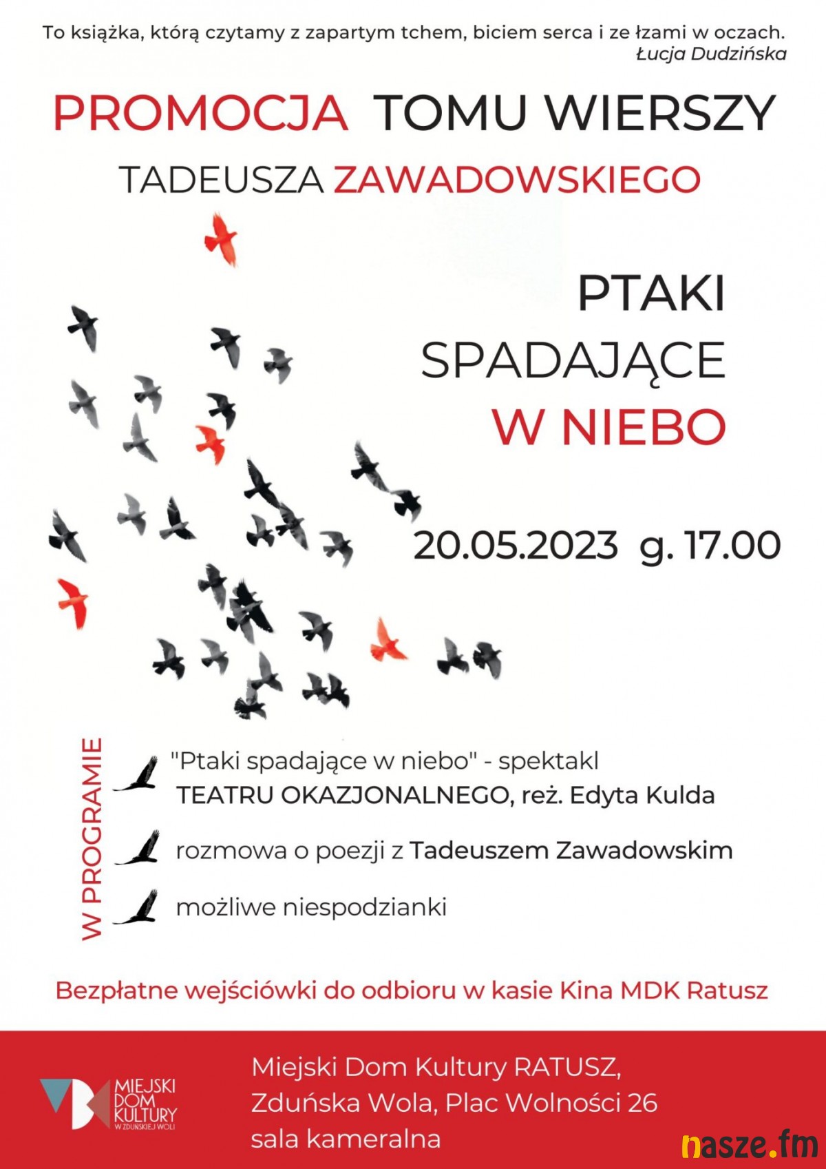 Podczas sobotniej promocji tomu wystąpi Teatr Okazjonalny w spektaklu pt. "Ptaki spadające w niebo" w reżyserii Edyty Kuldy. Nie zabraknie rozmowy o poezji i prezentacja wierszy z najnowszego tomu Tadeusza Zawadowskiego.
