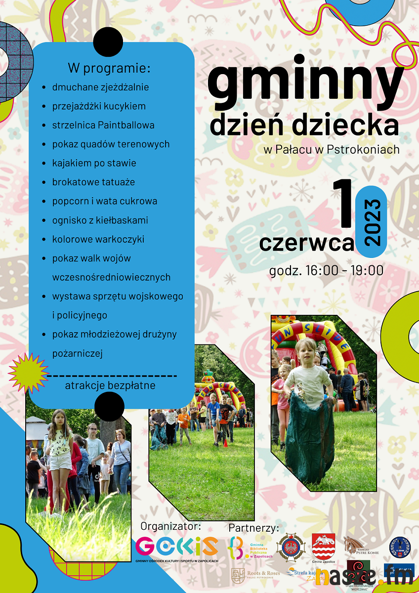Z okazji Dnia Dziecka sporo będzie się działo w naszym regionie. Na obchody święta najmłodszych zaprasza m.in. Gminny Ośrodek Kultury i Sportu w Zapolicach. Wydarzenie jutro, 1 czerwca, odbędzie się na terenie pałacu w Pstrokoniach.