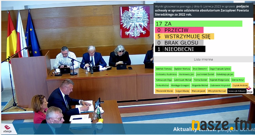 Ostatecznie radni zagłosowali korzystnie dla zarządu powiatu. 17 głosów to te za absolutorium i wotum zaufania, 5 było wstrzymujących. Jeden radny nie uczestniczył w obradach.