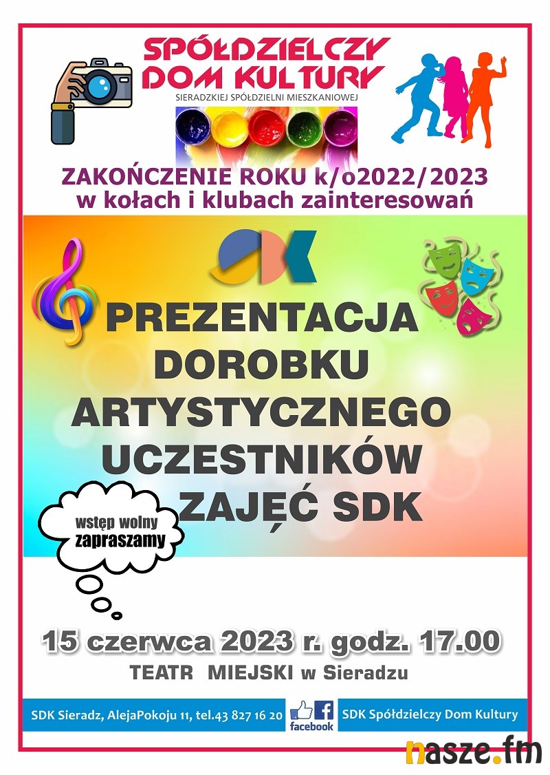 W najbliższy czwartek w Teatrze Miejskim w Sieradzu odbędzie się uroczyste zakończenie roku w kołach i klubach zainteresowań Spółdzielczego Domu Kultury w Sieradzu. Będzie to prezentacja dorobku artystycznego uczestników zajęć. Początek o 17, wstęp wolny