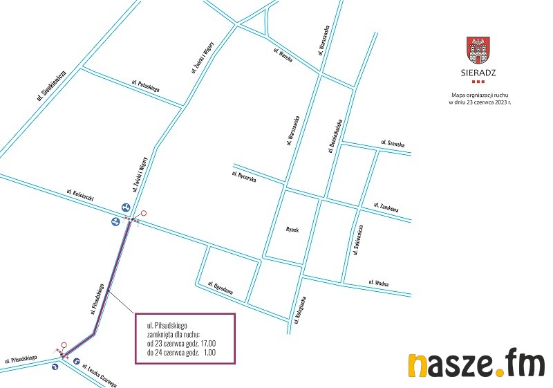- Organizacja wydarzenia wiążę się jednak z pewnymi utrudnieniami. Na czas koncertu zmieni się organizacja ruchu w centrum Sieradza W związku z organizacją wydarzenia informujemy, że w czasie trwania wydarzenia zmieni się organizacja ruchu w rejonie jego organizacji. W piątek 23 czerwca od godziny 17.00 do godz. 1.00 w nocy zamknięta dla ruchu będzie ulica Piłsudskiego, na odcinku od skrzyżowania z ul. Kościuszki do skrzyżowania z ul. Leszka Czarnego. W czwartek od godziny 17.00 zamknięte dla parkowania będą także parkingi na placu Wojewódzkim (bezpośrednio przy Urzędzie Miasta oraz w części przy dawnym domu handlowym Warta). Za wszelkie utrudnienia przepraszamy. - informuje Urząd Miasta Sieradza