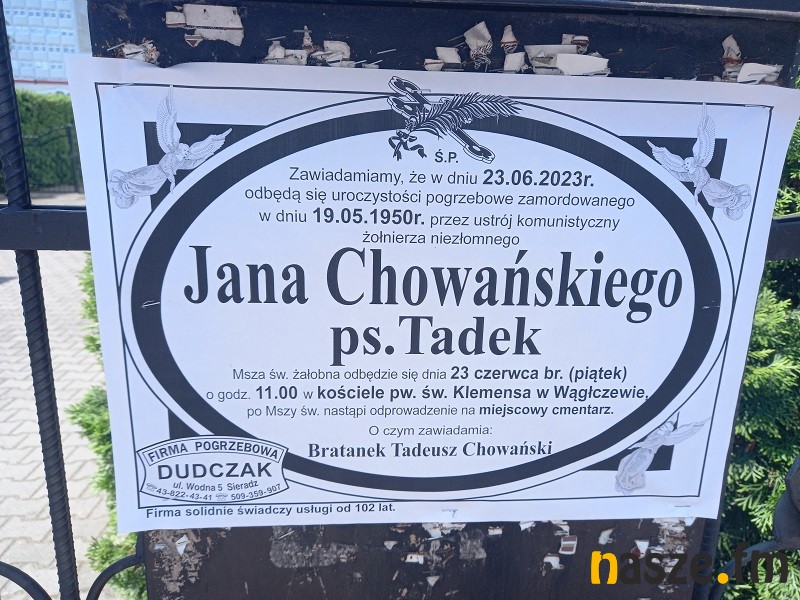 Dyrektor Oddziału Instytutu Pamięci Narodowej w Łodzi Mateusz Kotecki zaprasza na uroczystości pogrzebowe Jana Chowańskiego ps. Tadek żołnierza KWP ekshumowanego przez IPN, które odbędą się 23 czerwca 2023 r. o godz. 11.00 w kościele pw. Św. Klemensa w Wągłczewie (powiat sieradzki).