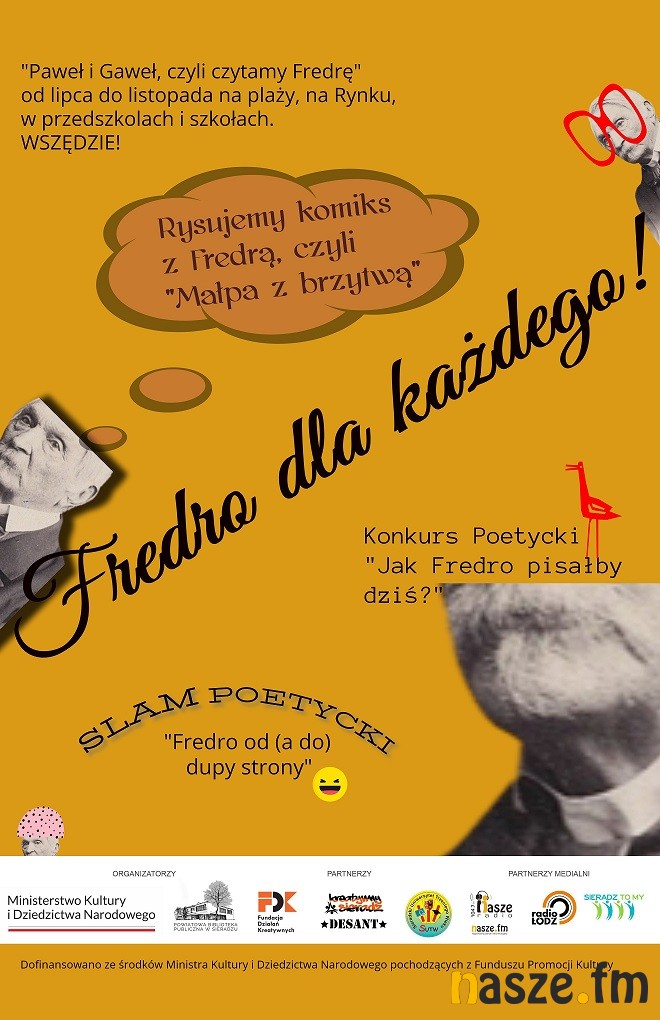 "Jak Fredro pisałby dziś?" - konkurs poetycki w dwóch kategoriach: na wiersz w stylistyce Fredry i na uwspółcześnioną wersję jednego z wierszy Patrona Roku 2023. Regulamin już wkrótce na stronie Powiatowej Biblioteki Publicznej w Sieradzu.