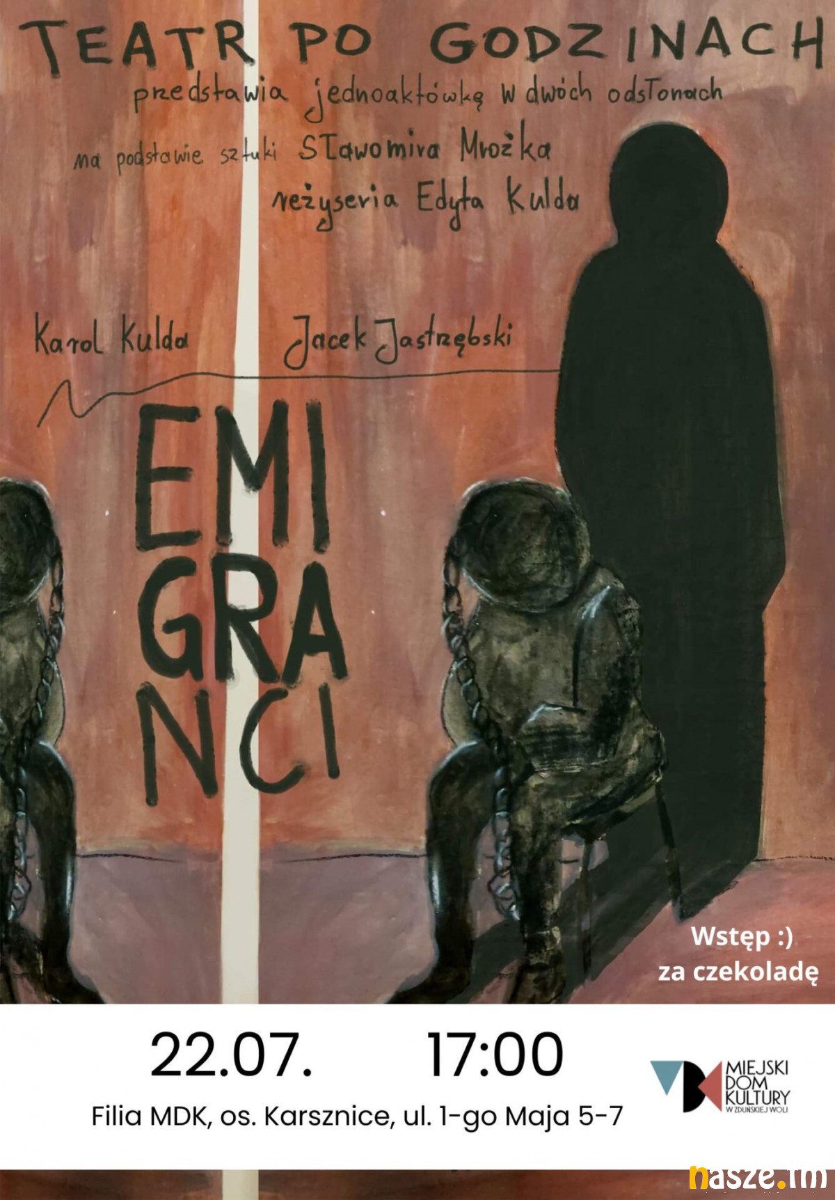 "Emigranci" to jedna z wielu jednoaktówek, sztuk teatralnych Sławomira Mrożka. Napisana w 1974 roku i mimo upływu czasu nie straciła na swojej świeżości i aktualności. "Teatr Po Godzinach", pracujący w MDK Ratusz w Zduńskiej Woli, zaprasza na spektakl pełen humoru, absurdu i refleksji nad stanem współczesnego człowieka, jego psychiki i miejsca w świecie.