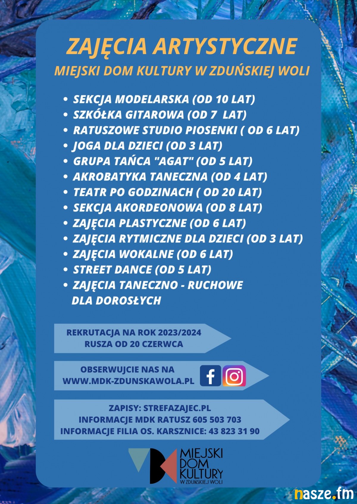 Mimo, że mamy jeszcze wakacje, to warto już teraz pomyśleć o dodatkowych zajęciach dla najmłodszych, ale nie tylko. Trwają zapisy na Zajęcia artystyczne na nowy rok szkolny W Miejskim Domu Kultury Ratusz w Zduńskiej Woli.