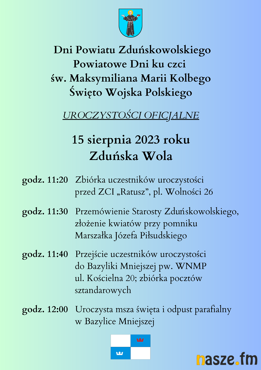 Z okazji 103. rocznicy Bitwy Warszawskiej i przypadającego w tym dniu Święta Wojska Polskiego, o godzinie 11:30 na pl. Wolności w Zduńskiej Woli przy pomniku Marszałka Józefa Piłsudskiego, Starosta Zduńskowolski Hanna Iwaniuk wygłosi okolicznościowe przemówienie, a delegacje organizacji kombatanckich, władz samorządowych, służb mundurowych, jednostek organizacyjnych, spółek, szkół i stowarzyszeń złożą wiązanki kwiatów. Następnie uczestnicy uroczystości przejdą do Bazyliki Mniejszej Wniebowzięcia Najświętszej Maryi Panny, gdzie o godzinie 12:00 zostanie odprawiona uroczysta msza święta.