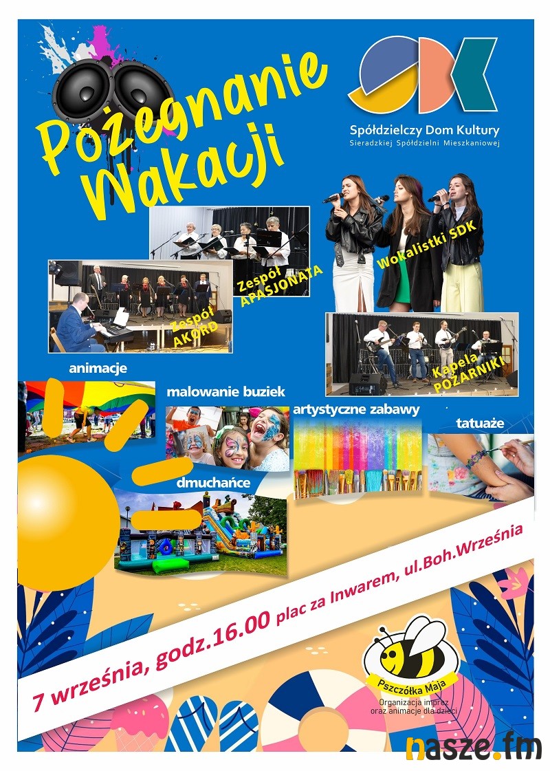 AKTUALIZACJA: Z powodu warunków atmosferycznych impreza została odwołana. Odbędzie się 7 września. Spółdzielczy Dom Kultury w Sieradzu zaprasza jutro, 30 sierpnia, na imprezę "Pożegnanie wakacji". W programie wiele niespodzianek dla całych rodzin. Zabawy plastyczne, malowanie buziek a także występy artystyczne.