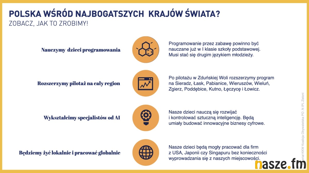 Możemy być pierwszym regionem w Polsce, który wyposaży młodzież w zaawansowane kompetencje programistyczne. Zapewnią one naszym dzieciom i wnukom wysokopłatną pracę. Co ważne będą one mogły pracować dla firm z USA, Japonii czy Singapuru bez konieczności wyprowadzania się z naszych miejscowości. Jako cyfrowi specjaliści będą mogli żyć koło nas, lokalnie, a przez internet pracować i zarabiać globalnie.