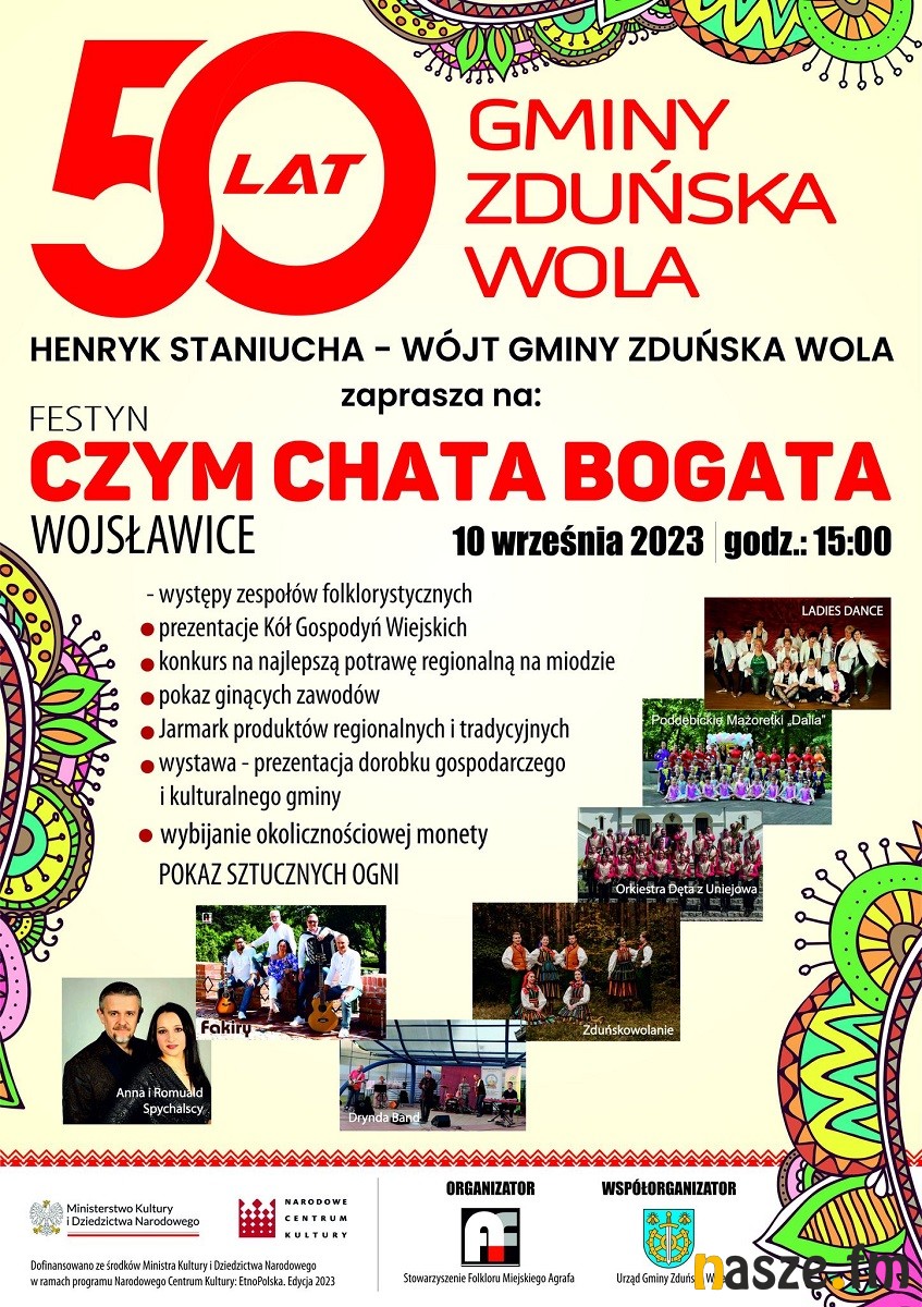 Stowarzyszenie Folkloru Miejskiego Agrafa oraz Urząd Gminy Zduńska Wola zapraszają w najbliższą niedzielę, 10 września, do Wojsławic. Na boisku bocznym przy tamtejszej szkole podstawowej odbędzie się festyn "Czym chata bogata". Wydarzenie organizowane jest w ramach obchodów przypadającego w tym roku 50-lecia samorządu.