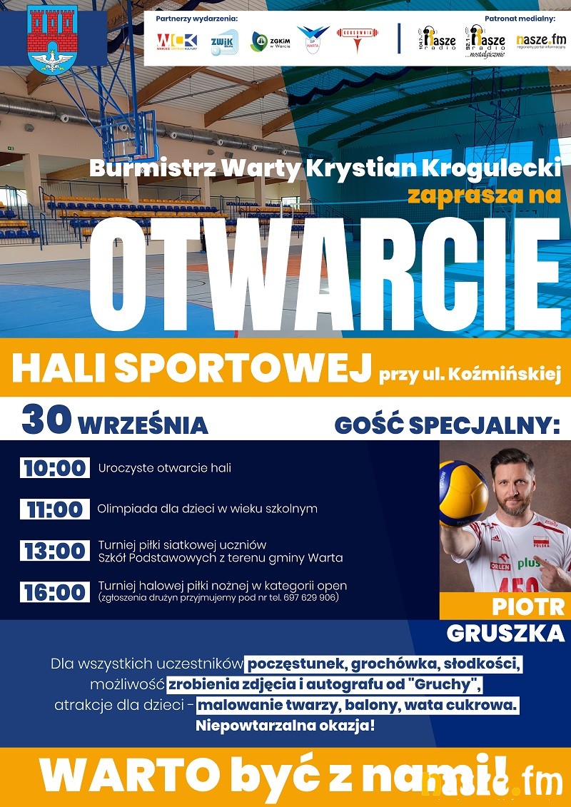Dziś w Warcie odbędzie się oficjalne otwarcie nowego obiektu sportowego, który powstał przy Szkole Podstawowej im.kpt.pil. Stanisława Skarżyńskiego w Warcie. W programie otwarcia zaplanowano sporo atrakcji m.in. olimpiadę dla dzieci, turnieje sportowe a także występy artystyczne. Gościem specjalnym będzie Mistrz Europy z 2009 roku, znany siatkarz Piotr Gruszka.