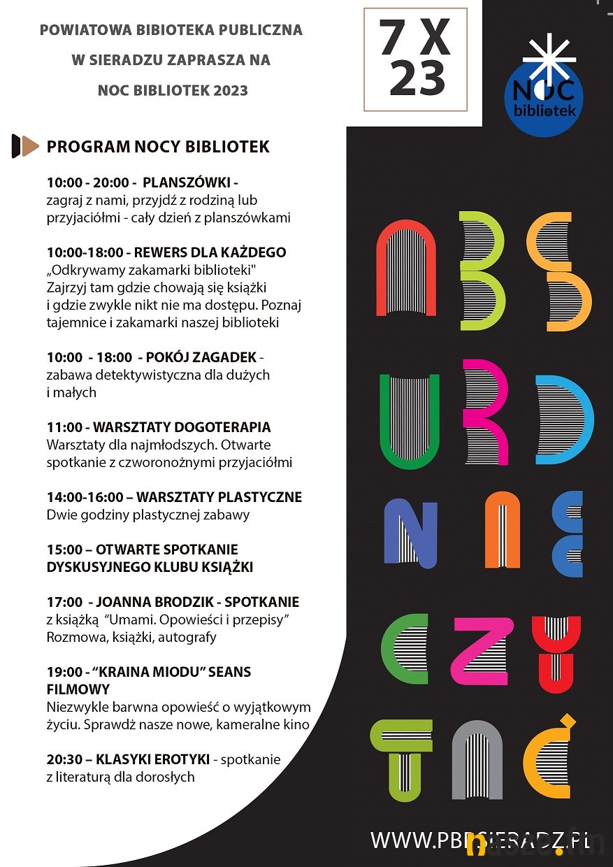 Powiatowa Biblioteka Publiczna w Sieradzu postanowiła przyłączyć się do dziesiątek bibliotek w kraju, które tego dnia szerzej otwierają swoje podwoje. - W ubiegłym roku do późnych godzin nocnych bawiliśmy się wspólnie z naszymi czytelnikami. W tym roku będziemy do Waszej dyspozycji w sobotę 7 października w godz. 10:00-20:00 i z pewnością przez te kilkanaście godzin znajdziecie u nas coś ciekawego dla siebie - zachęcają pracownicy PBP. Zaplanowali m.in. spotkanie z Joanną Brodzik.