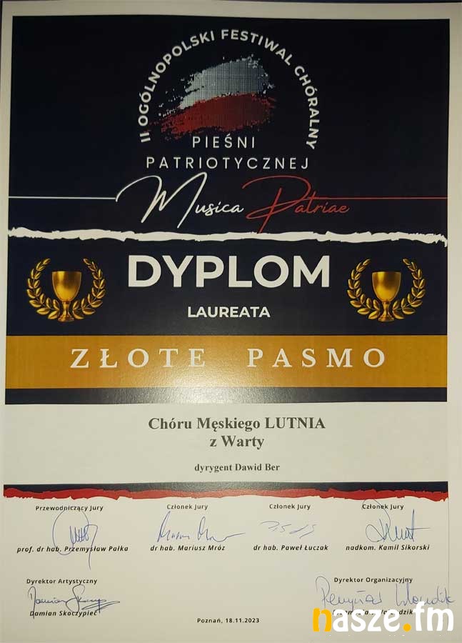 Wczoraj w Poznaniu odbył się II Ogólnopolski Festiwal Chóralny Pieśni Patriotycznej Musica Patriae. Na Festiwalu zaprezentował się m.in. Chór Męski Lutnia z Warty. Artyści otrzymali dyplom laureata Złote Pasmo oraz nagrodę specjalną.