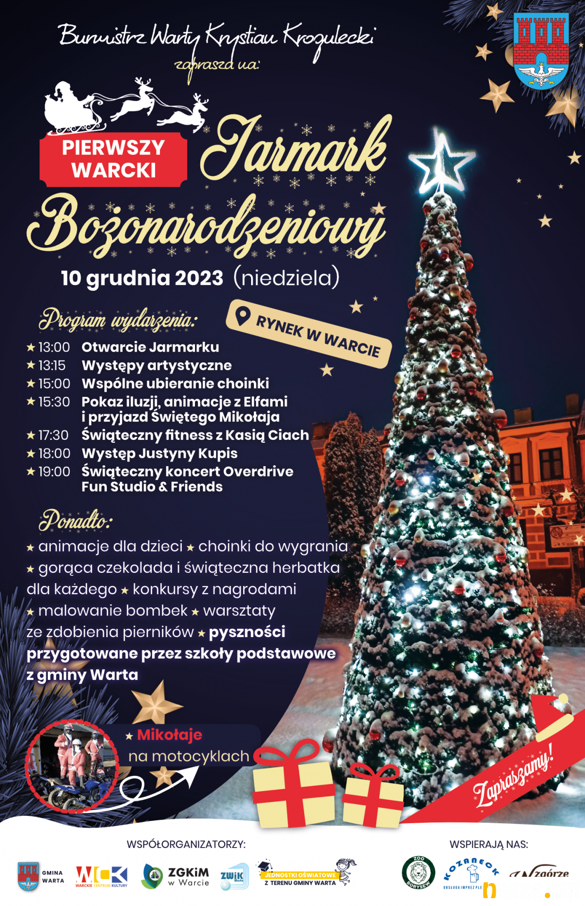 Ponadto: stoiska lokalnych firm i placówek oświatowych z Gminy Warta, gorąca czekolada i świąteczna herbata dla każdego, konkursy z nagrodami(do wygrania choinki), malowanie bombek, warsztaty ze zdobienia pierników, Mikołaje na motocyklach. Początek o godzinie 13, wstęp wolny.