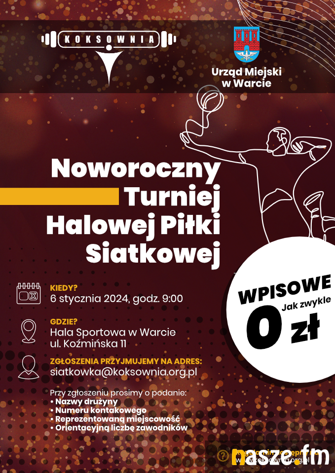 Stowarzyszenie Koksownia zaprasza na Noworoczny Turniej Halowej Piłki Siatkowej. Zawody odbędą się w sobotę w hali w Warcie. Początek zmagań o godzinie 9:00.