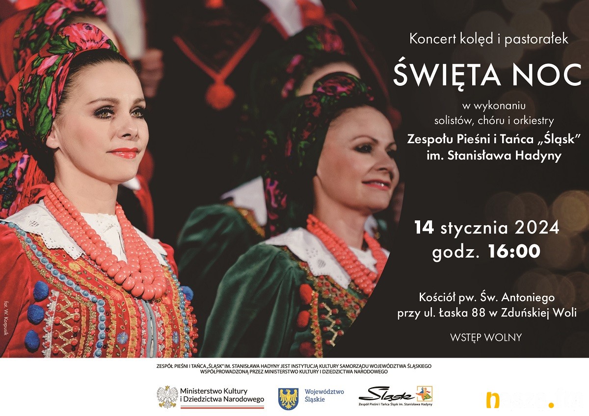 Zgromadzenie Księży Orionistów zaprasza na koncert kolęd i pastorałek pt. "Święta Noc" w wykonaniu Zespołu Pieśni i Tańca "Śląsk". Wydarzenie odbędzie się dziś w kościele św. Antoniego w Zduńskiej Woli.