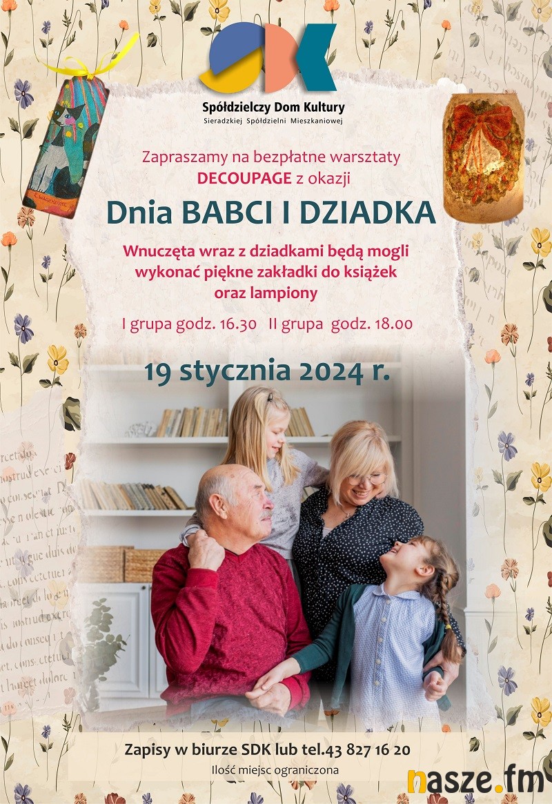 Spółdzielczy Dom Kultury w Sieradzu zaprasza 19 stycznia na warsztaty z okazji Dnia Babci i Dziadka. Instruktorzy będą uczyć jak stworzyć lampiony i zakładki do książek metodą decoupage.