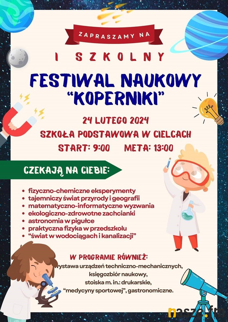 Jutro, 24 lutego, w Szkole Podstawowej im. Mikołaja Kopernika w Cielcach (gm. Warta) odbędzie się I Festiwal Naukowy "Koperniki". W świat nauki wprowadzą uczestników m.in. fizyczno-chemiczne eksperymenty, przyrodnicze doświadczenia, matematyczne analizy. Nie zabraknie też pierników!