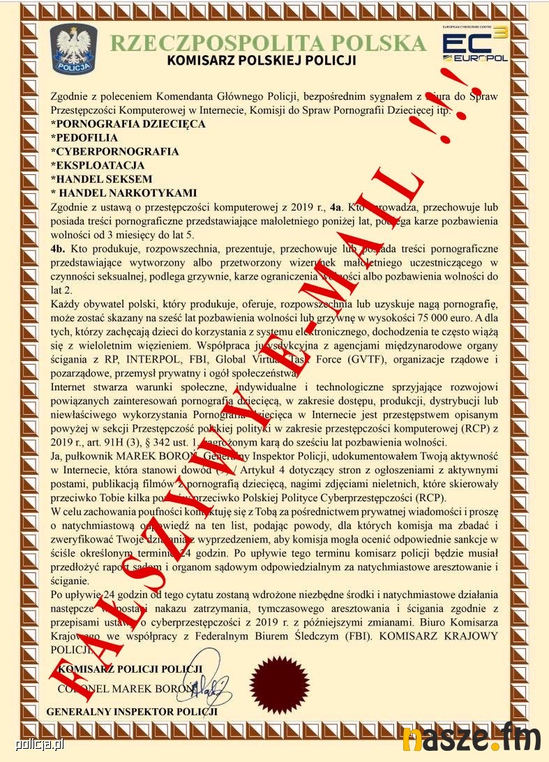 Policja przestrzega przed fałszywymi e-mailami od oszustów, którzy podszywają się Komendanta Głównego Policji insp. Marka Boronia. Z ich treści wynika, że osoba, która jest adresatem, podejrzana jest o dokonanie przestępstw o treściach pornograficznych i jest zobowiązana do udzielenia odpowiedzi.