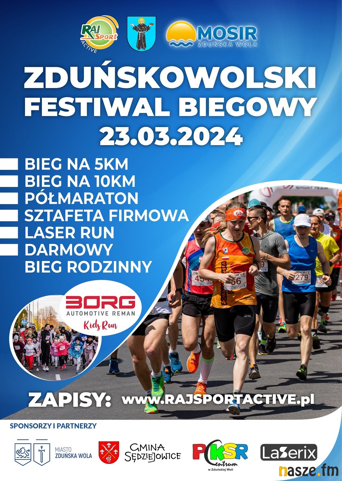 Tego dnia wystartuje również Zduńskowolski Festiwal Biegowy, a na nim: bieg rodzinny, sztafeta firmowa, bieg na 5 km, bieg na 10 km, półmaraton i laser run. Otwarcie biura zawodów przy ul. Dolnej 41 zaplanowano na godzinę 9:00.