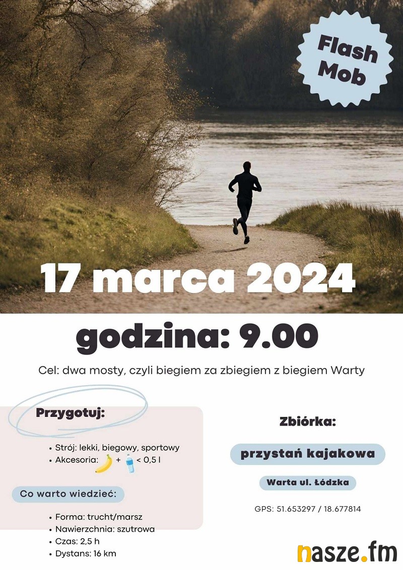Gmina Warta warta jest inicjatyw, które podkreślają niezwykłość jej walorów przyrodniczych i krajobrazowych. W takich okolicznościach przyrody aż się chce zażywać aktywności fizycznej. W najbliższą niedzielę, 17 marca o godzinie 9 Szkoła Podstawowa im. Mikołaja Kopernika w Cielcach zwołuje kolejny FLASH MOB, tym razem pod intrygującym tytułem: Dwa mosty, czyli biegiem za zbiegiem z biegiem Warty. Wiosna tuż, więc kto żyw tężyzną się skrzy, nawet gdy mży. Wydarzenie skierowane jest do każdego!