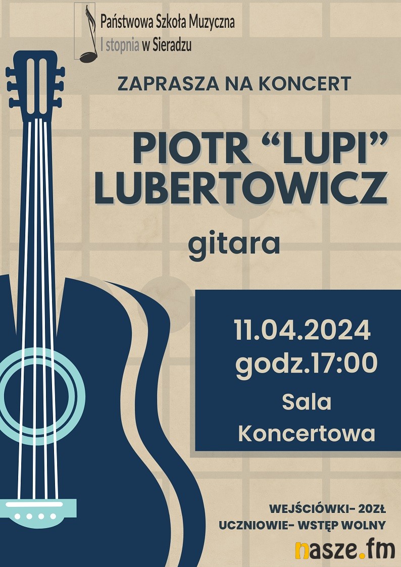 Na koncert muzycznej legendy z Podhala zaprasza dziś szkoła muzyczna w Sieradzu. W sali koncertowej wystąpi Piotr "Lupi" Lubertowicz - wokalista, gitarzysta, autor tekstów z Nowego Targu. Od końca lat 80-tych związany z polską sceną blues-rockową , a szczególnie z zespołami: "Monkey Business", "Easy Rider ", a także ze Sławkiem Wierzcholskim i "Nocną Zmianą Bluesa". Koncert rozpocznie się o godz. 17:00.