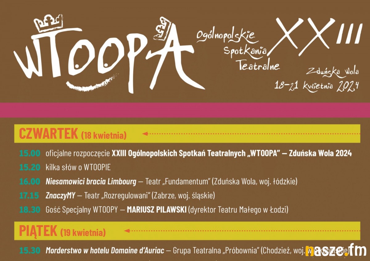 Jutro, 18 kwietnia, w Zduńskiej Woli rozpocznie się wielkie teatralne święto. WTOOPA - Ogólnopolskie Spotkania Teatralne odbędą się już po raz dwudziesty trzeci, a w Zduńskiej Woli miłośnicy teatru spotkają się po raz szósty. Przez trzy dni w sali widowiskowej Miejskiego Domu kultury Ratusz prezentować będą się grupy teatralne z całej Polski.