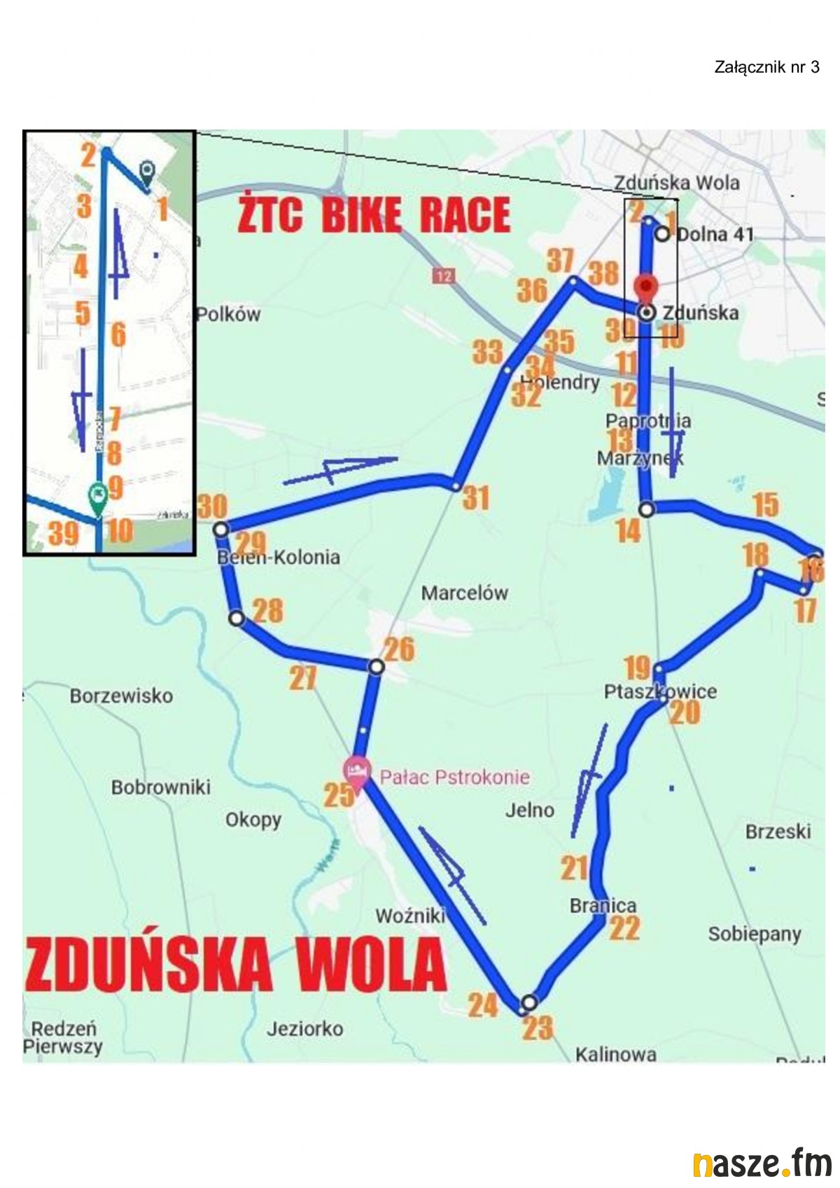 Wyścig wystartuje o 12:00 na ulicy Dolnej przy Powiatowym Międzyszkolnym Ośrodku Sportowym. Zawodnicy przejadą przez ulice: Główną, Paprocką i Podmiejską. Następnie pojadą drogą powiatową przez Marzynek, Młodawin Gorny, Ptaszkowice, Branicę, Rembieszów, Pstrokonie i Zapolice, gdzie kierować się będą w stronę ulicy Sieradzkiej skąd ruszą do Belenia. Następnie pojadą przez Zmyśloną do drogi powiatowej do Zduńskiej Woli. Na koniec trasa wiedzie przez Widawską, Zduńską i Paprocką.