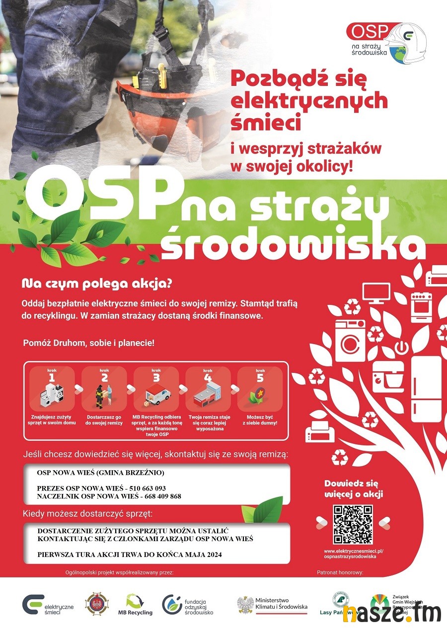Do remizy można dostarczać zużyty sprzęt elektryczny, który trafi do recyklingu. Za każdą zebraną tonę otrzyma potem środki finansowe na doposażenie jednostki. Pierwsza tura tej akcji trwa do końca bm. Strażacy z Nowej Wsi liczą na wasze wsparcie. Szczegóły na plakacie.