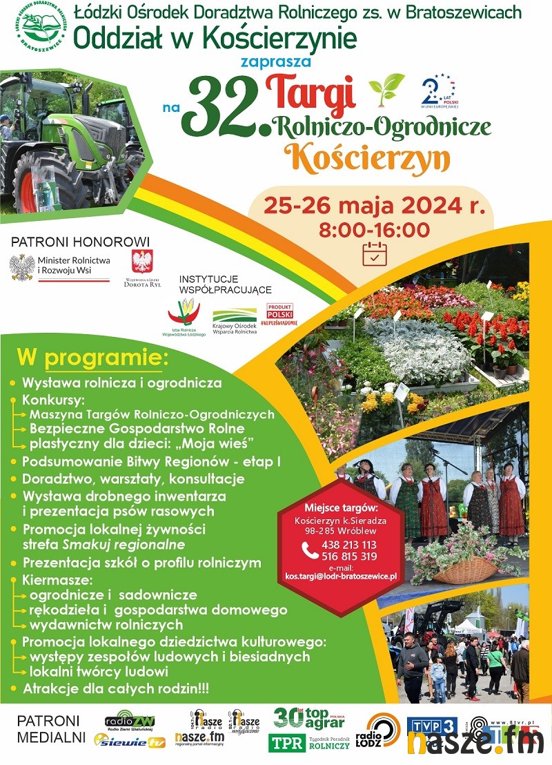 i jego otoczenia wokół zagadnień postępu naukowo-technicznego, podnoszenia standardów gospodarstw rolnych, poprawy warunków życia rodzin wiejskich i rozwoju lokalnego. Trwać będą od godziny 8.00 do 16.00 - wstęp dla zwiedzających bezpłatny. Cała impreza odbywać się będzie w parku otaczającym siedzibę ŁODR oraz na poletkach obok siedziby Oddziału. Do dyspozycji uczestników zapewniamy dogodne parkingi – informuje ŁODR w Bratoszewicach oddział w Kościerzynie.