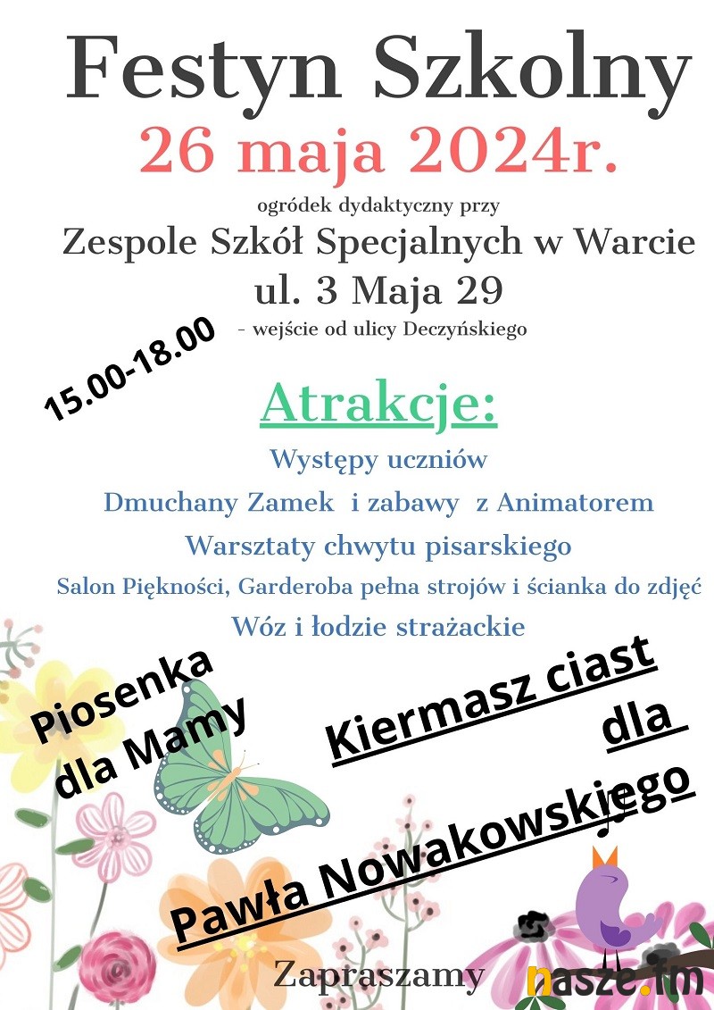 Festyn Szkolny w Zespole Szkół Specjalnych odbędzie się w ogródku dydaktycznym w godzinach 15.00-18.00. W programie zabawy z animatorem, warsztaty chwytu pisarskiego prowadzone przez Stowarzyszenie "Razem możemy wiele" w Warcie, salon piękności, pokaz sprzętu strażackiego i akcent uroczysty dla wszystkich Mam. Podczas festynu odbędzie się kiermasz ciast dla Pawła Nowakowskiego.