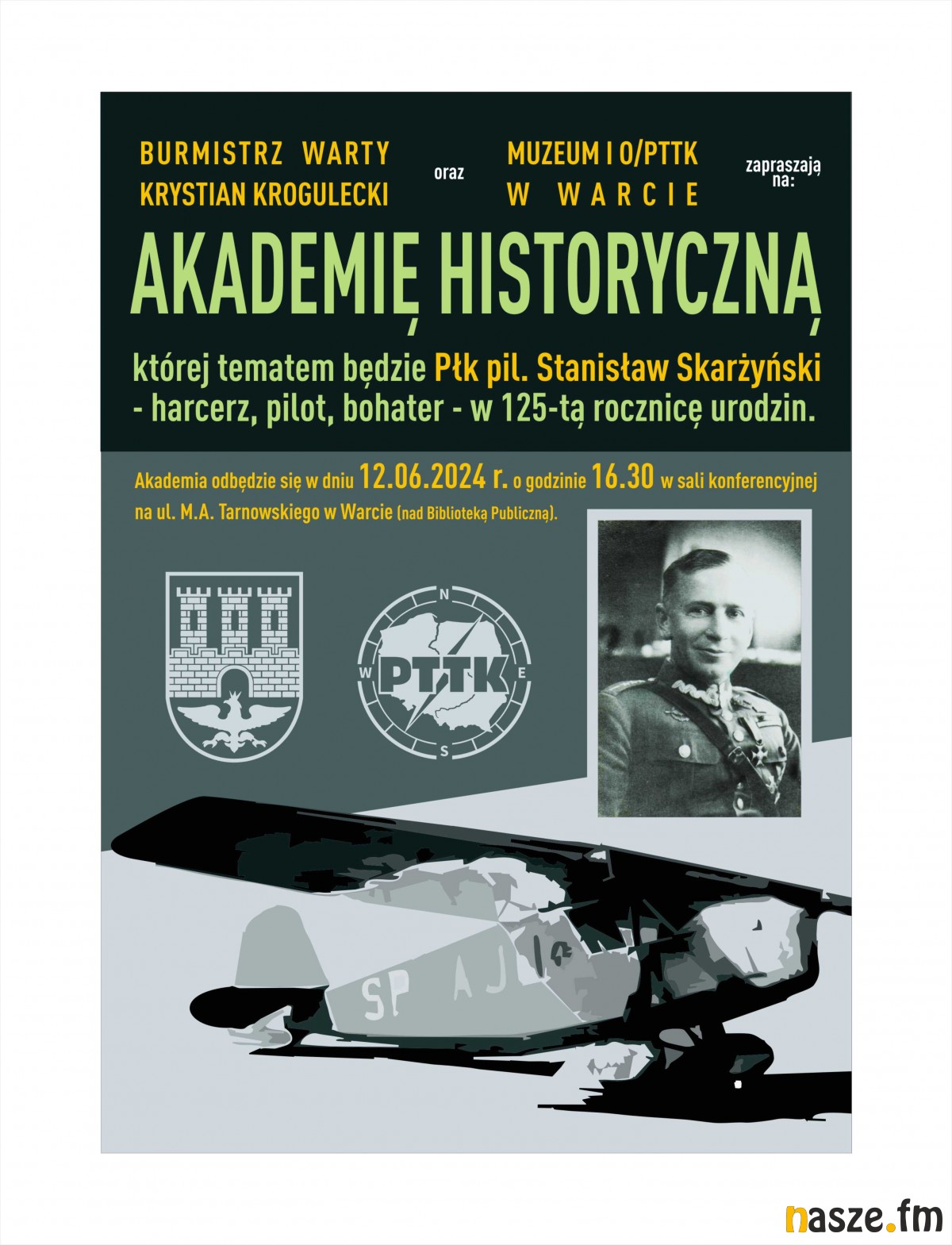 Na Akademię zapraszają Burmistrz Warty Krystian Krogulecki oraz Muzeum I O/PTTK. Tematem będzie Płk pil. Stanisław Skarżyński- harcerz, pilot, bohater- w 125-tą rocznicę urodzin. Akademia odbędzie o godzinie 16:30 w sali konferencyjnej na ul. M. A. Tarnowskiego w Warcie (nad Biblioteką Publiczną). Wstęp wolny.