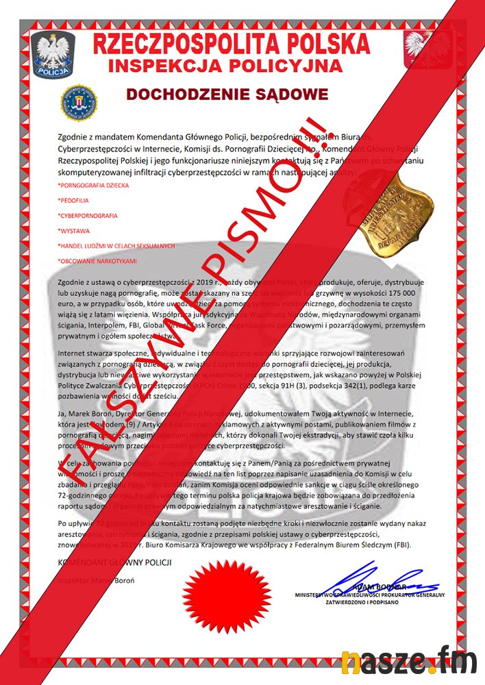 W celu uwiarygodnienia swojej wiadomości przestępcy podpisują ją, jako Komendant Główny Policji insp. Marek Boroń i Ministerstwo Sprawiedliwości Prokurator Generalny Adam Bodnar.
