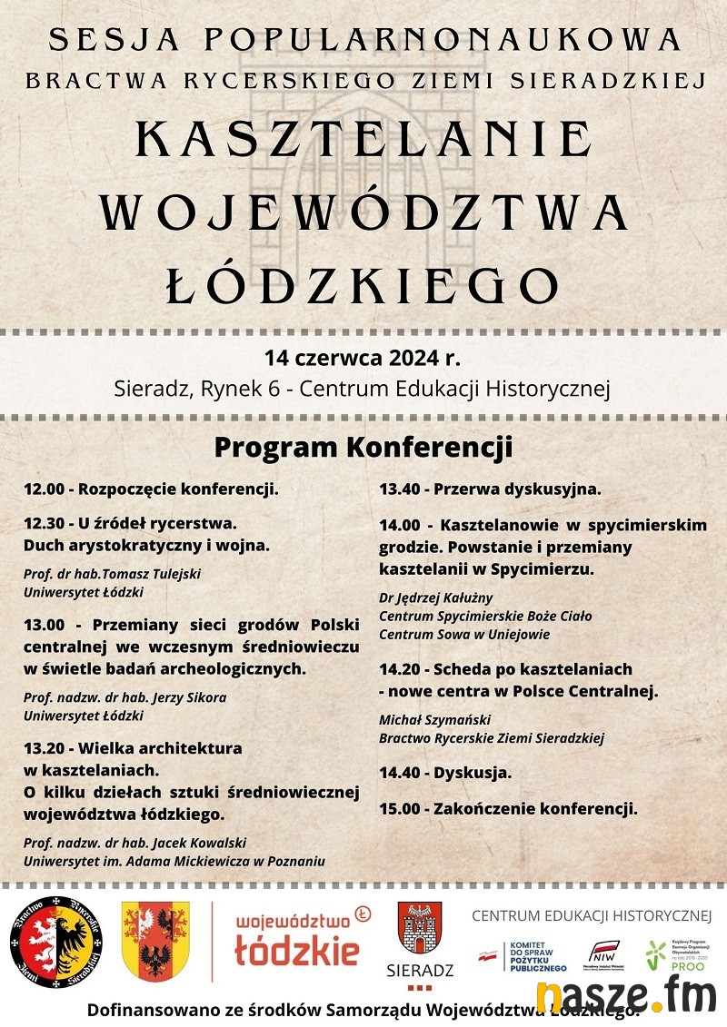 Bractwo Rycerskie Ziemi Sieradzkiej zaprasza na konferencję: Kasztelanie Województwa Łódzkiego - sesja popularnonaukowa 14 czerwca 2024 w Sieradzu, Rynek 6 - Centrum Edukacji Historycznej.