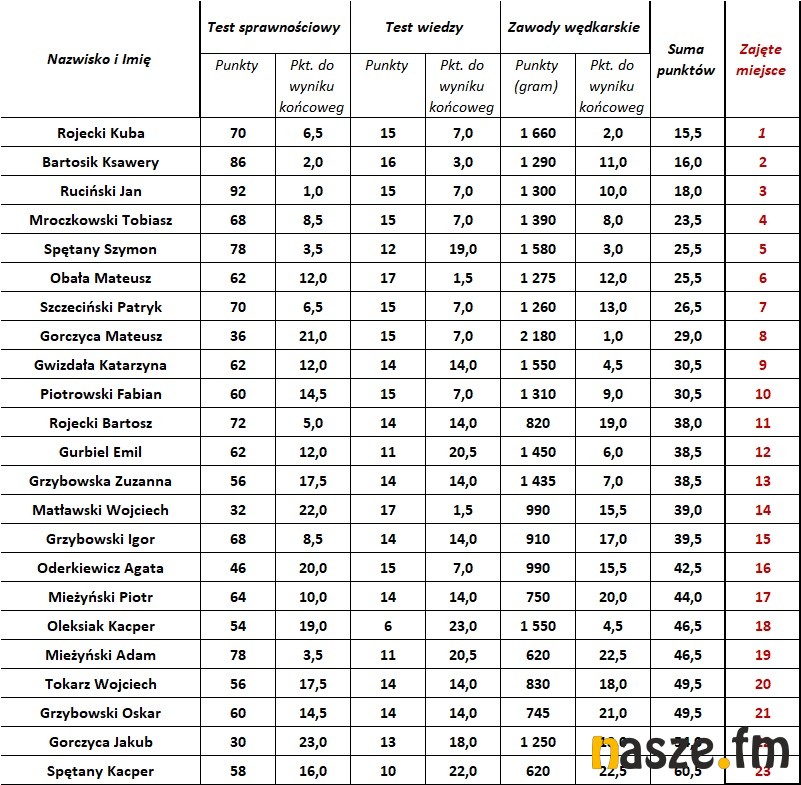 - Łowiono głównie płocie, wzdręgi i okonie i sumiki karłowate. Przyłowem były karasie. Ważenie złowionych ryb odbywało się w obecności - opiekunów. Po zakończeniu ważenia - przeprowadzono test sprawnościowy. Rzuty do tarczy odbywały się z pozycji siedzącej z odległości około ośmiu metrów. Po zakończeniu rywalizacji - zarówno zawodnicy jak i ich opiekunowie - posilili się kiełbaską i kaszanką z grilla. Jej upieczenia pilnowały mamy zawodników. Do chleba było pyszne, czosnkowe masło - relacjonują organizatorzy Olimpiady.