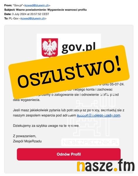 Uwaga na oszustwo internetowe. Przestępcy przesyłają fałszywą wiadomość podszywając się pod rządową witrynę. Ostrzegamy przed klikaniem w podane linki.