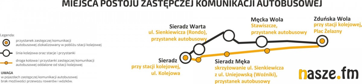 Zamiast niektórych pociągów Łódzkiej Kolei Aglomeracyjnej pomiędzy tymi stacjami zostaną uruchomione autobusy. Dokładne informacje są umieszczone na rozkładzie jazdy pociągów. Zastępcza Komunikacja Autobusowa między Zduńską Wolą i Sieradzem będzie miała przystanki w następujących miejscach: