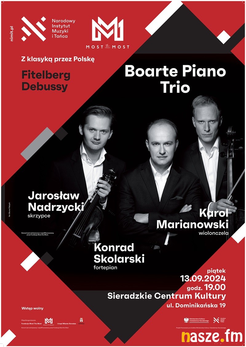 Boarte Piano Trio współtworzy trzech wybitnych polskich muzyków: Konrad Skolarski, Jarosław Nadrzycki i Karol Marianowski. W piątek będzie można ich posłuchać w Sieradzkim Centrum Kultury. Bezpłatne, podwójne zaproszenia można odbierać w kasie SCK przy ul. Dominikańskiej 19.
