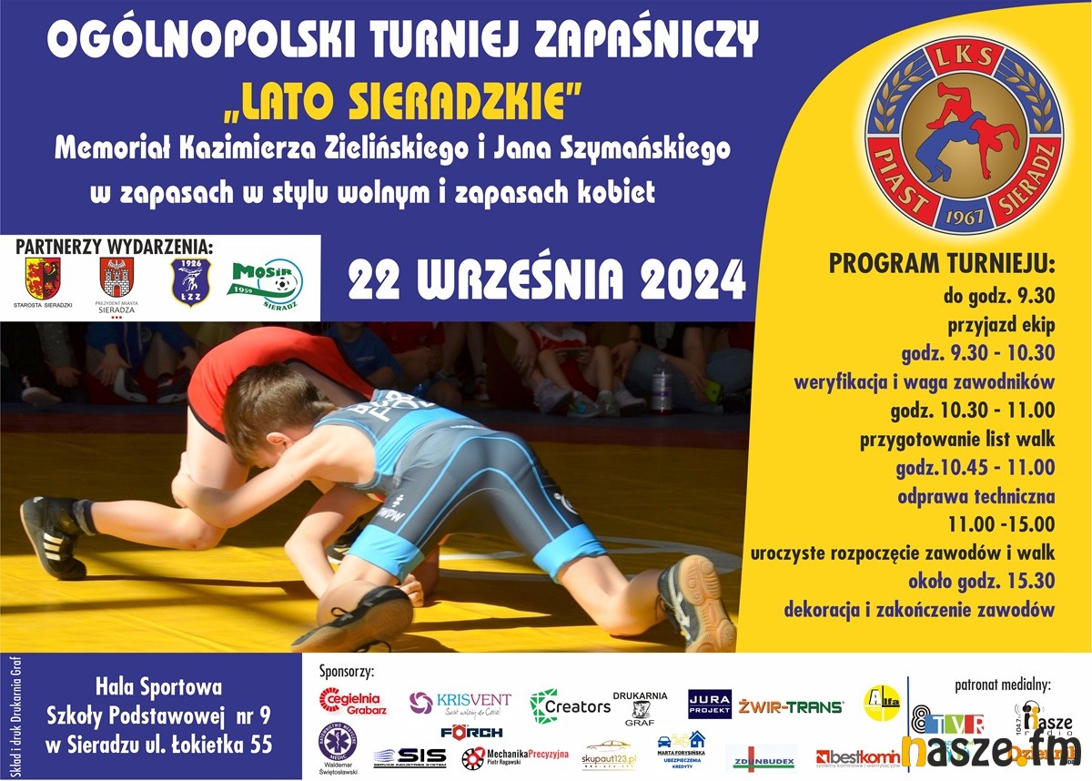 Klub LKS Piast Sieradz zaprasza na Ogólnopolski Turniej „Lato Sieradzkie” – Memoriał imienia Kazimierza Zielińskiego i Jana Szymańskiego w zapasach w stylu wolnym i w zapasach kobiet. Impreza odbędzie się w niedzielę w hali MOSiR-u przy Szkoły Podstawowej nr 9 w Sieradzu.