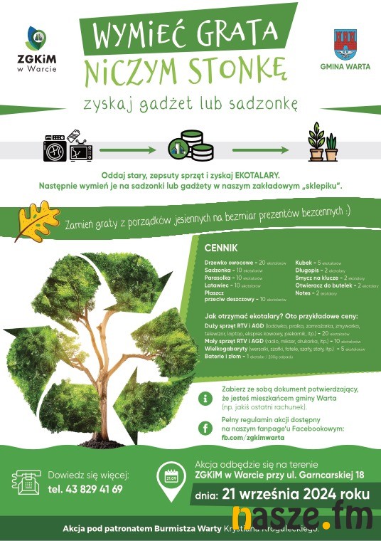 Każdy uczestnik chcący skorzystać z akcji musi zabrać ze sobą dokument potwierdzający jego zamieszkanie na terenie gminy Warta (np. ostatni opłacony rachunek za śmieci). Regulamin akcji dostępny jest między innymi w Urzędzie Miejskim w Warcie. Więcej informacji uzyskają pod numerem: 43 28 94 169.