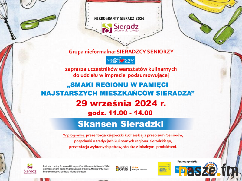 A w niedzielę, 29 września 2024 r w godzinach 11:00 - 14:00 w Skansenie Sieradzkim odbędzie się spotkanie kończące projekt. Grupa nieformalna Sieradzkich Seniorów zaprasza uczestników warsztatów w ramach lokalnego programu MIKROGRANTY SIERADZ 2024 "Smaki regionu w pamięci najstarszych mieszkańców Sieradza" na event podsumowujący projekt.