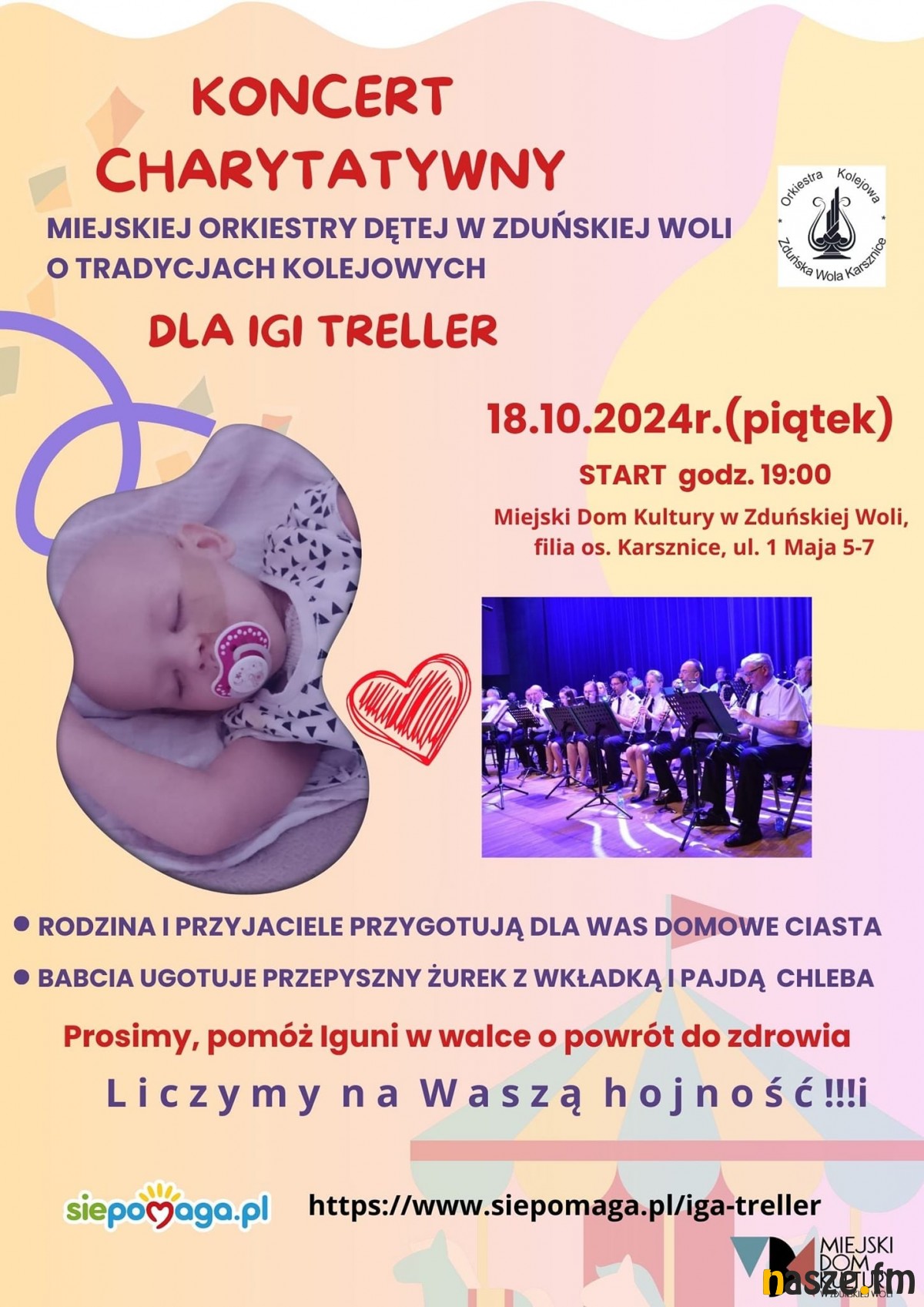 To będzie kolejna okazja, żeby wesprzeć leczenie Igi Treller ze Zduńskiej Woli. Niespełna 2-letnia dziewczynka zmaga się ze złośliwym nowotworem mózgu. Jutro, 18 października, w Filii Miejskiego Domu Kultury na osiedlu Karsznice odbędzie się koncert charytatywny Miejskiej Orkiestry Dętej w Zduńskiej Woli o Tradycjach Kolejowych. Podczas wydarzenia będą zbierane pieniądze na kosztowne leczenie Igi.