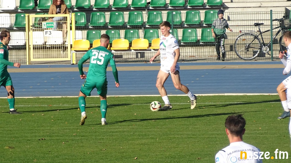Biało-Zieloni mieli szansę, by zdobyć kolejną bramkę z linii jedenastu metrów. Tym razem poszkodowany został Abdullahi Oyedele. Do rzutu karnego ponownie podszedł Kręcichwost. Tym razem napastnik Warty nie był tak skuteczny. Uderzył płasko i bramkarz obronił. Tuż przed przerwą zawodnik z Mławy uderzył zza pola karnego z powietrza i piłka nieznacznie minęła bramkę sieradzan. Pierwsza połowa zakończyła się prowadzeniem Warty 1:0. W drugiej również nie brakowało dobrych okazji. Skuteczni byli jednak tylko piłkarze Warty. W 79 minucie po podaniu Kręcichwosta gola strzelił Mateusz Popczyk, który kwadrans wcześniej zmienił na boisku Oyedele.